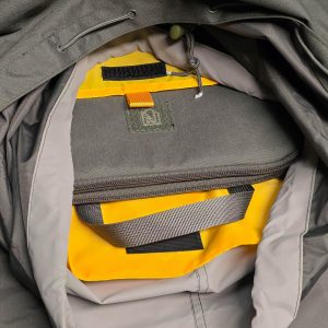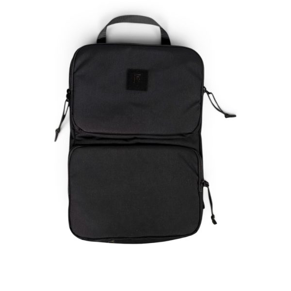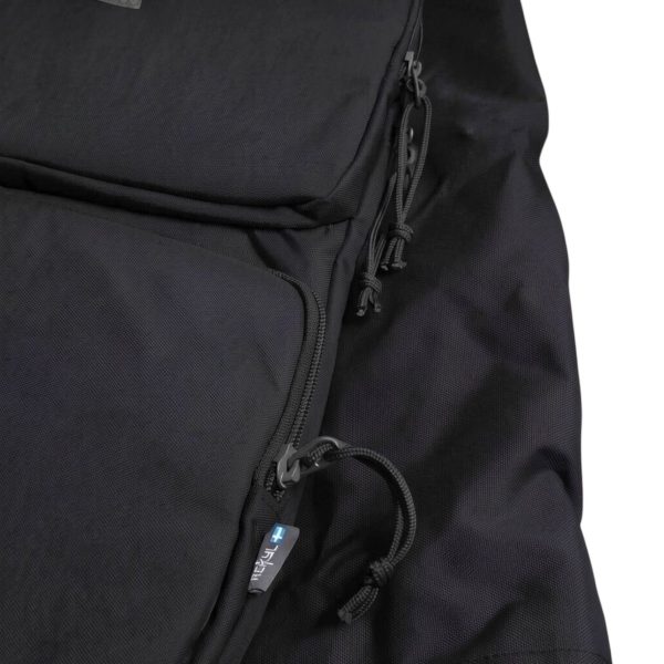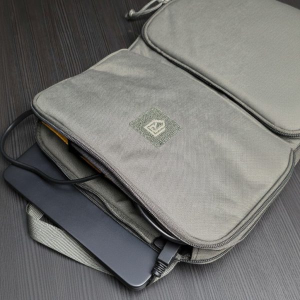Sleeven rymmer laptops upp till 35 × 23 cm och har tre fickor: en för datorn, två för resten — laddare, kablar, pennor, vad du nu stoppar ner. Allt på sin plats. Dras upp med paracordhandtag. Sitter precis som det ska i uppdragsäcken.